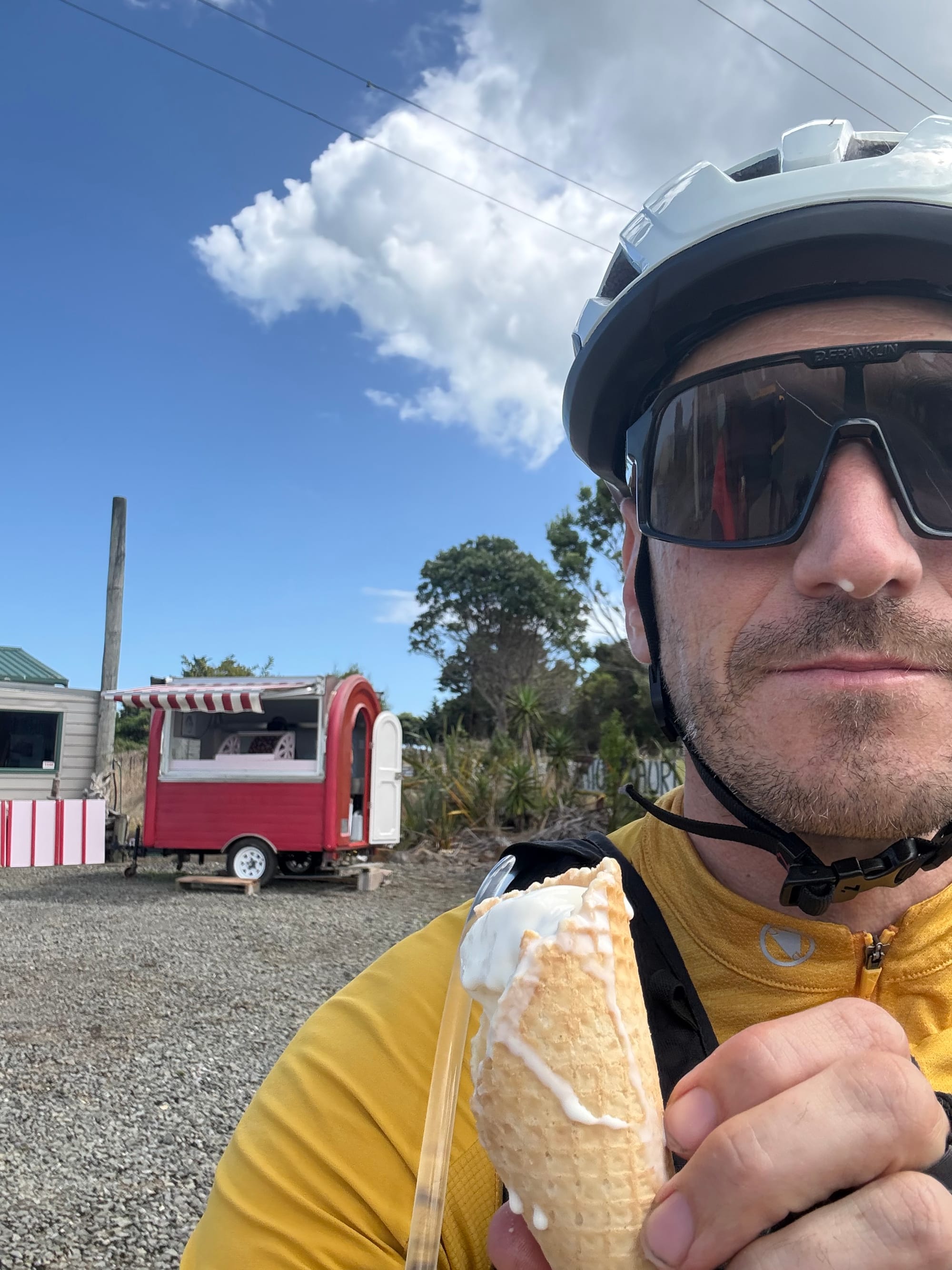 Long descent then more climbing and getting a bit warm there was a little ice cream stall just at the top of the last climb so I stopped. They said they were just opening up and we would be their first customers so I suggested they take a promo photo of us. They cracked both cones as clearly learning on the job but we showed the good side for the photo and they gave them to us for free. Basic ice creams (we found out later they were $5).