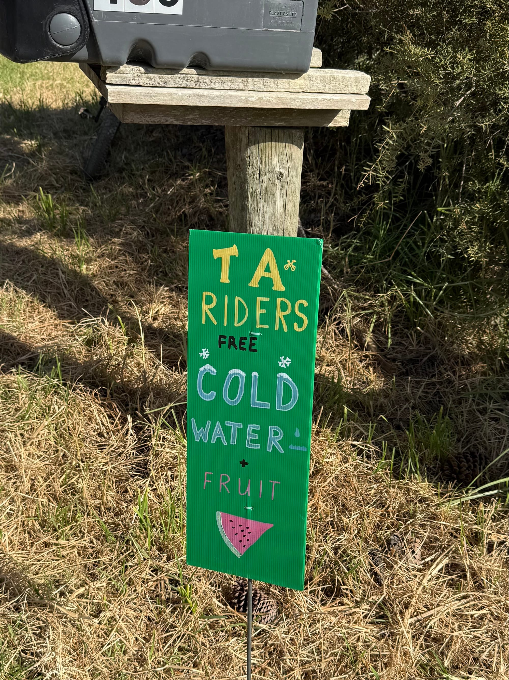 Hot and dry and my water low, and what I had was warm, there was a trail angel family with cold water and watermelon plus frozen grapes. They are famous as been doing it a long time and we got the origin story and were treated to a trick involving crossing between two moving cargo bikes.
