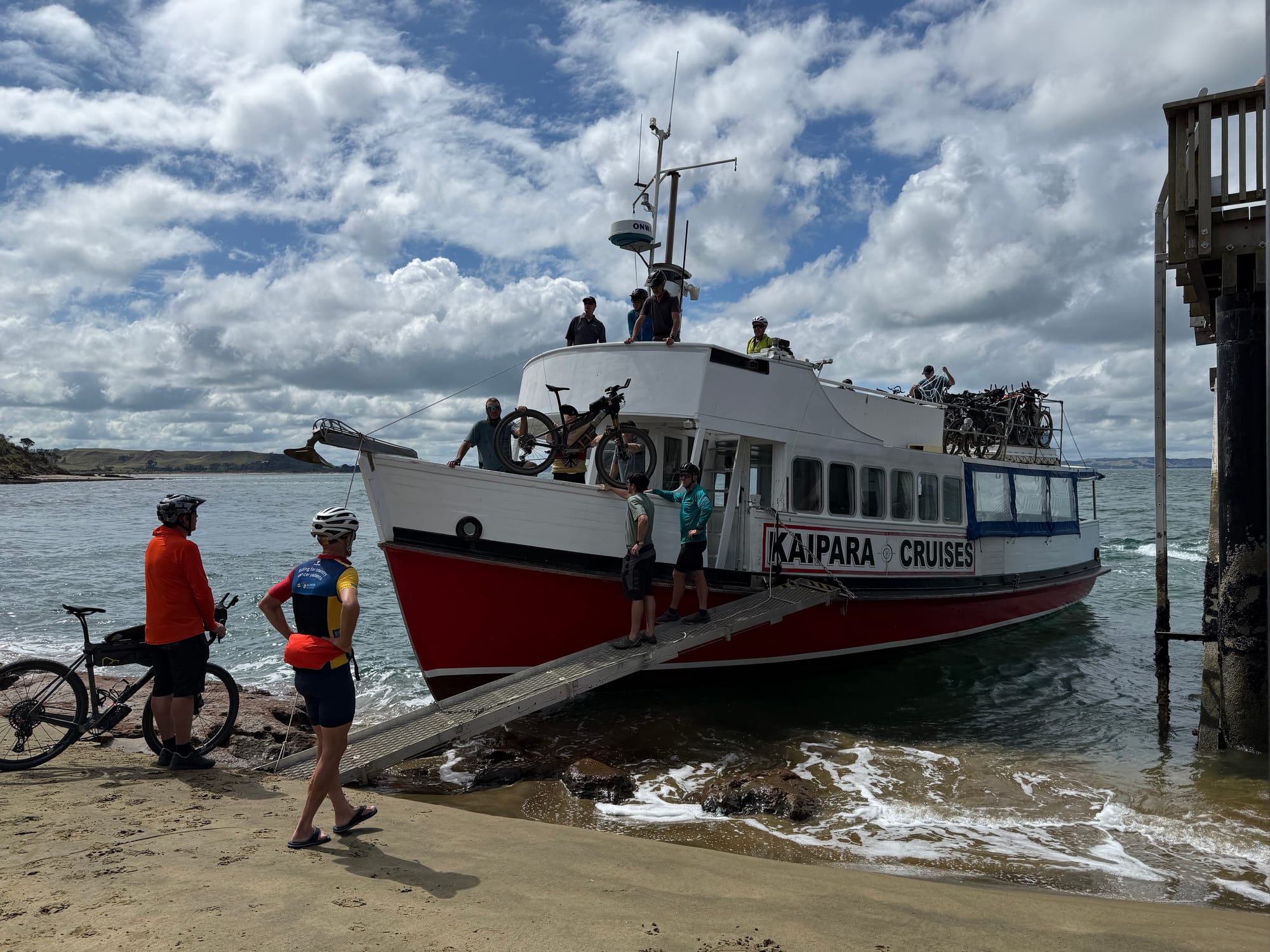 Hot day everyone was sitting around waiting for ferry outside campsite. Not much in Poutu Point. Eventually the call went out: ferry had arrived and so everyone gradually went down. Volunteers were sought to help load bikes. An upper body weakling I didn't volunteer but Scott did. My bike was one of the first and I was snapped with Scott's bike in queue to load (hopefully that pic won't go anywhere as bike way too big for me!). A couple of people turned up very late, hot and tired just making the ferry in time, to cheers from the crowd.