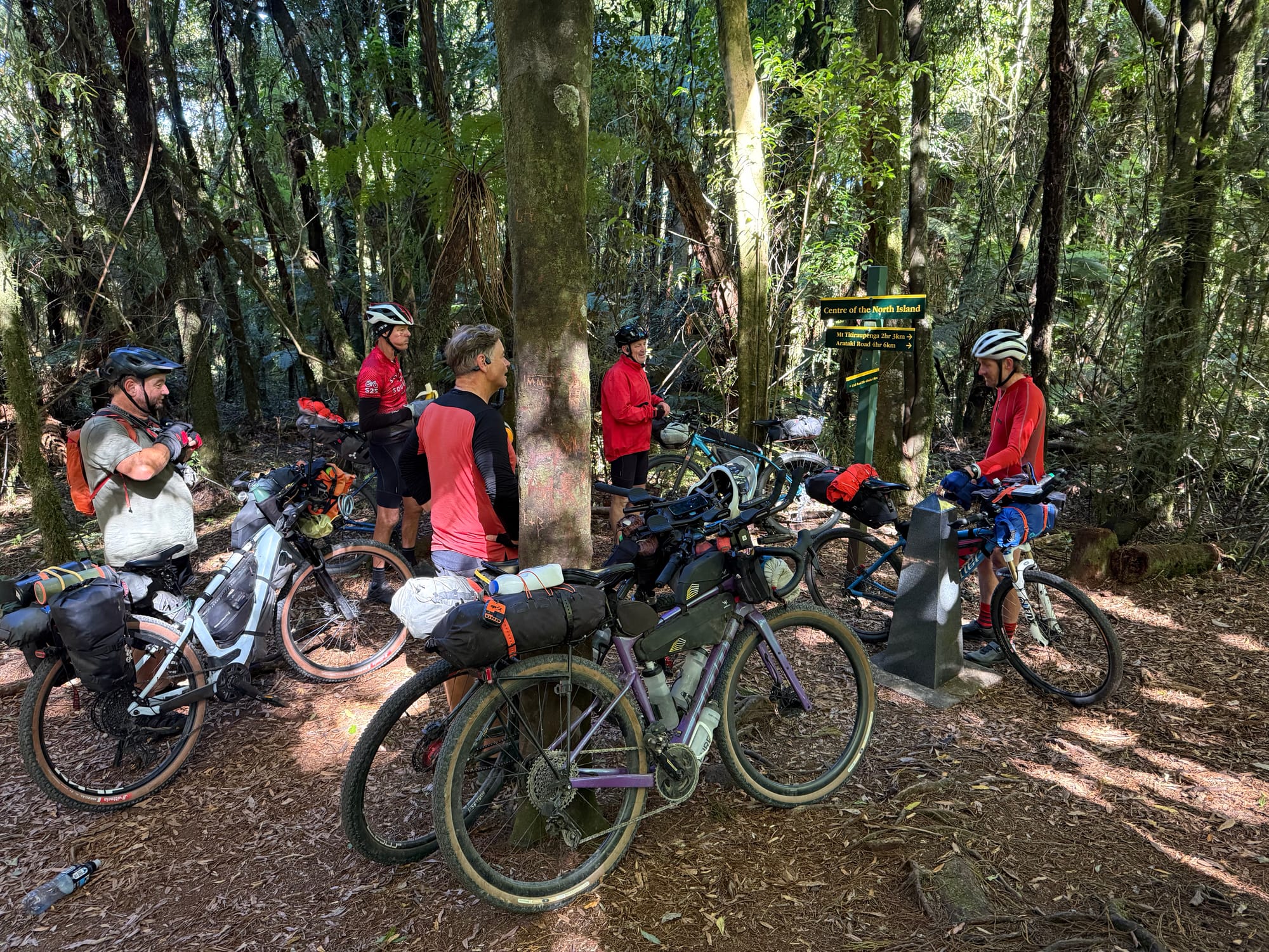 A big breakfast from last night's no-need-to-carry-far resupply we didn't get out the door till 6:50. Jonathan was a few minutes after that. It was cold and I hadn't put warm gloves on. I couldn't feel my fingers so reluctantly had to stop and dig out gloves which I hadn't made accessible in expectation the North Island would not be cold this time of year! One of my electronic shifters was also not working in the cold but I fortunately had the luxury of buttons on my aerobars as well. Jonathan and, non-TA bike packer Justin on a heavily loaded e-bike, caught me up and we collected Scott and Brett at some point and carried on to towards the Timber Trail.