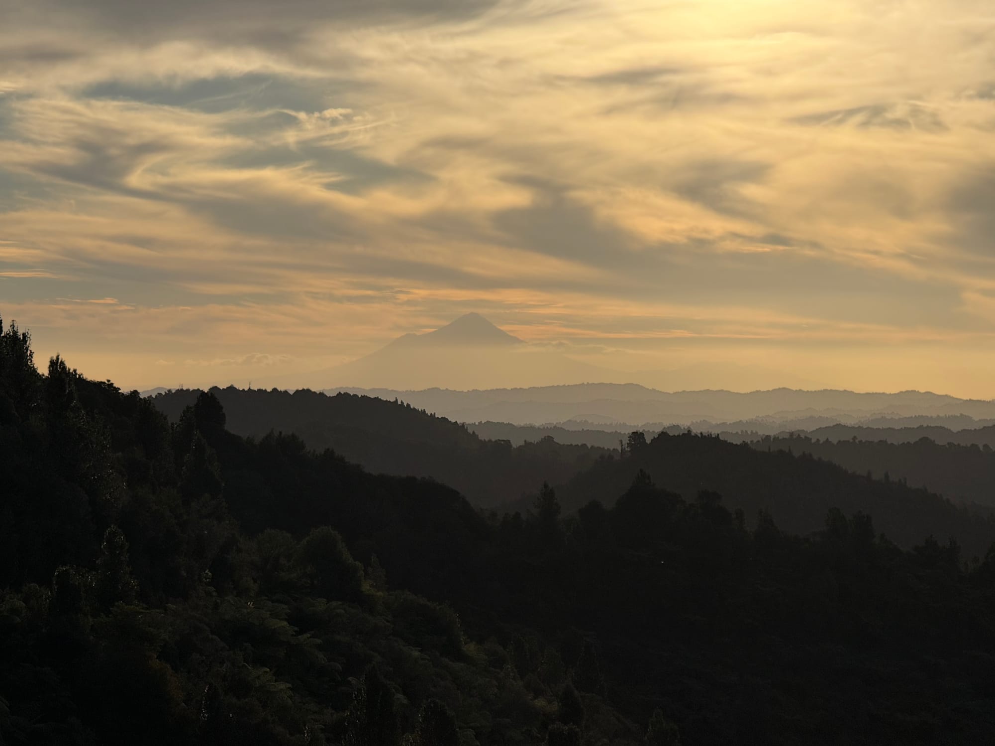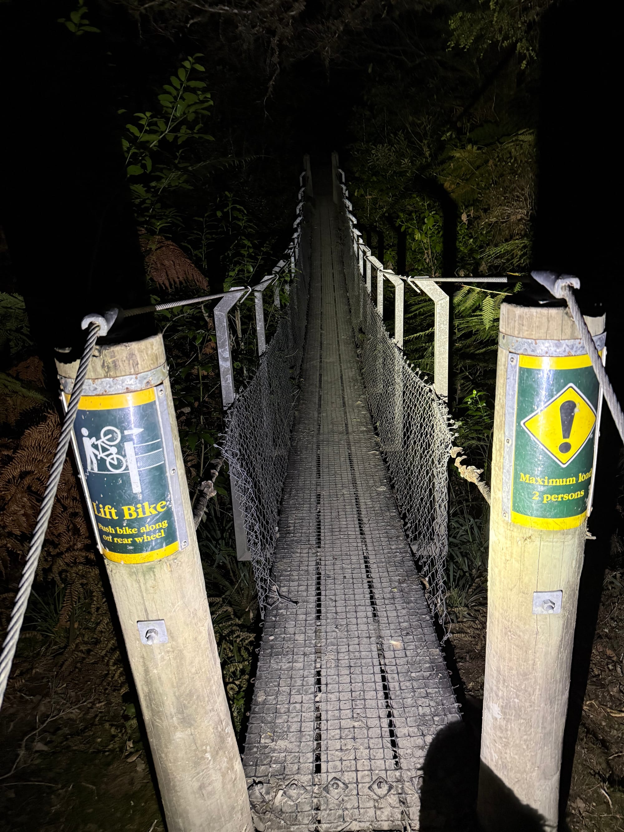 At the top the (by now) fire road forked at the summit there was a short walk to a lookout which both of us did. We could see Mt Ngauruhoe/Tongariro to the east and Mt Taranaki to the west in the misty evening light. The descent was muddy and rough, not a good combo on a gravel bike especially with my dry bag coming loose repeatedly as a result. Slow progress for me. Scott got well ahead. Before long it was dark and the bridges narrow enough to have to tilt the bike up.