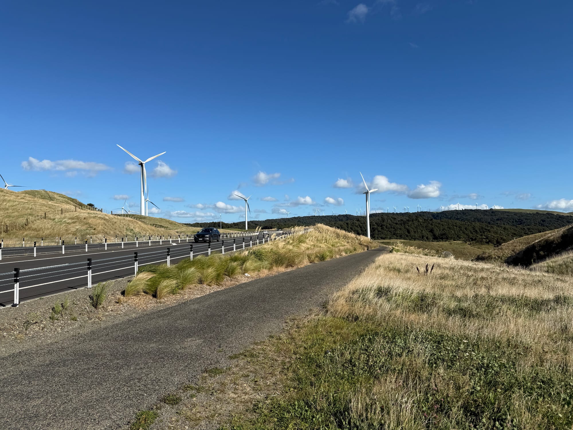 Checked the tracker and Scott and Brett still a ways back and only intending to get to Pahiatua so I headed off up the hill on my own. The climb over the new road was well set up with wide separated cycle paths but very windy, hence the numerous wind turbines I guess. Riding close by the turbines themselves felt like being in the Wild Robot movie with the stopped ones looking "sad". The descent with strong cross winds was sketchy at times, having to slow right down to avoid being blown into a fence.