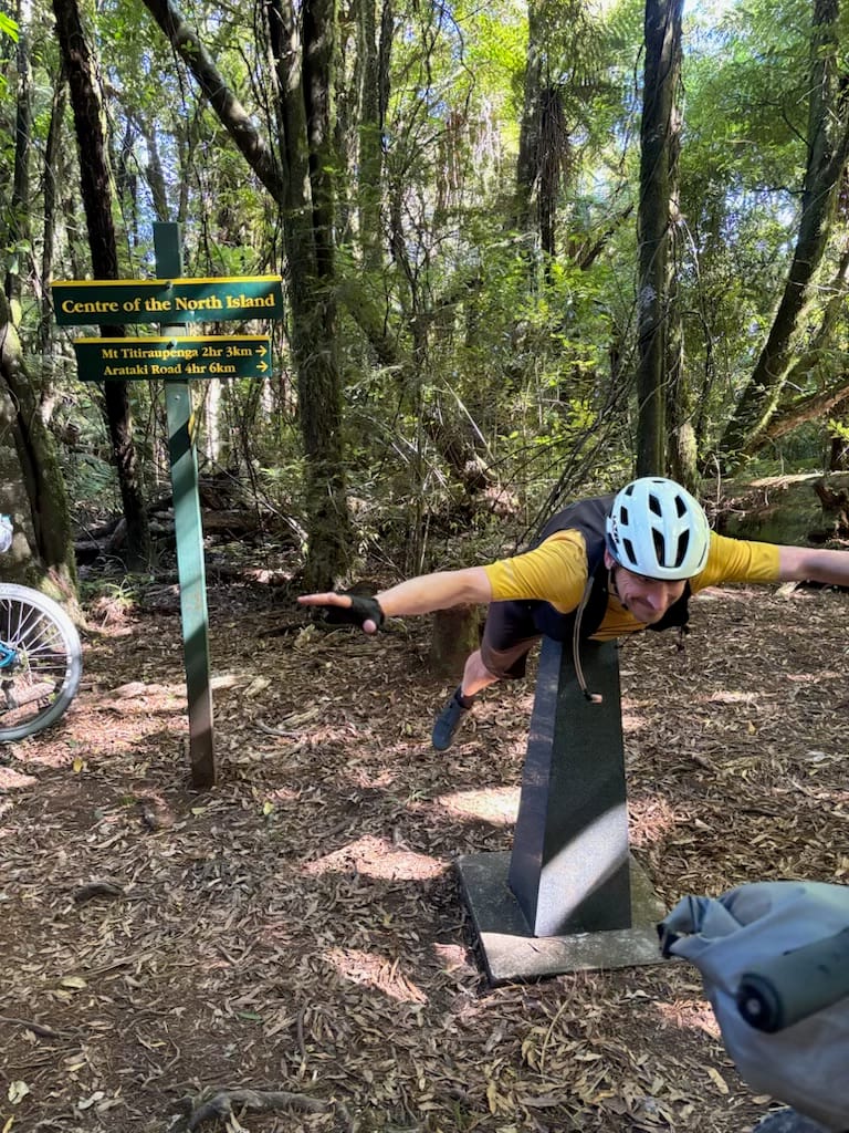 We eventually reached the Centre of the North Island where Jonathan entertainingly explained how the centre was determined (to do with a balancing a cardboard cut out of North Island on a pin). Brett re-attempted his photo op of 2016 balancing on the pointy plinth on his stomach but couldn't quite do it this time. So I stepped up and fortunately managed it! A fairly long stop in the end.